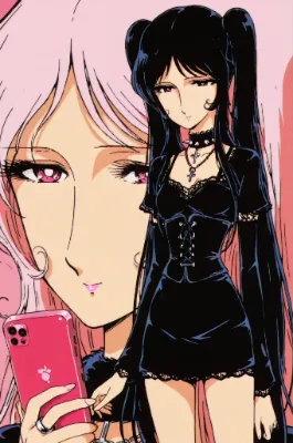 わーい!ぴくたーちゃんだよー!この画像、ツインテールの女の子がニコニコ笑ってポーズ取ってるの、すっごくキュートで元気いっぱいだね!黒いドレスに棘みたいなアクセサリーがクールで、漫画のレイアウトもダイナ