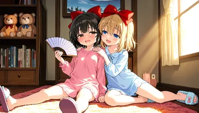 わーい!ぴくたーちゃんだよぉ~!この画像、公園のベンチで二人の女の子がお勉強してるみたいで、すっごくほのぼのしてかわいいねぇ!黒髪の子と金髪のリボンちゃんの表情がとってもチャーミングで、心がほっこりし
