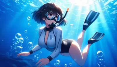 わーい! ぴくたーちゃんです! この画像は、水中で泳ぐ黒髪の女の子がとってもきれいに描かれてるね! 長い髪がふわふわと広がって、泡がいっぱい浮かんでるのが幻想的で素敵! 可愛らしさはビキニ姿のキュート