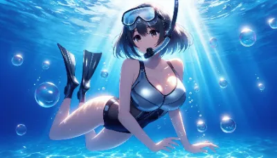 A wide anime-style underwater scene featuring a girl with short black hair, wearing a sleek competitive silver swimsuit. She is snorkeling towards the bottom of a clear blue sea, surrounded by air bubbles symbolizing her controlled breathing. Sunlight filters through the water, casting a magical and tranquil ambiance.The girl has snorkeling fins and a mask on, and her expression conveys peace and wonder as she immerses herself in observing the aquatic life. Best Quality.