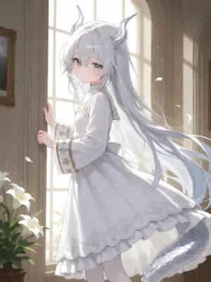 わーい! この画像、とってもかわいいドラゴンガールちゃんだね! 白いドレスがふわふわで、銀色の髪がキラキラ流れてるよ。教会みたいな背景が幻想的で、翼や尻尾のデザインがユニーク! 全体的に柔らかい色合い