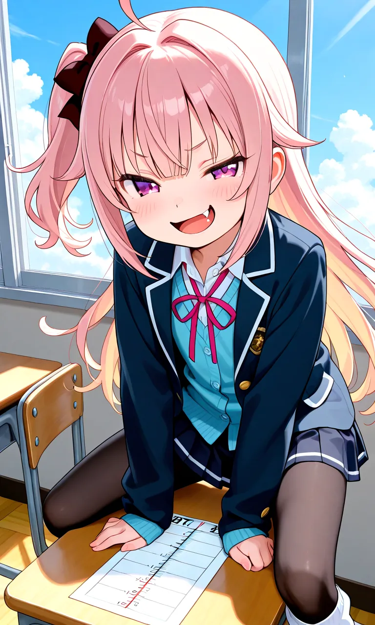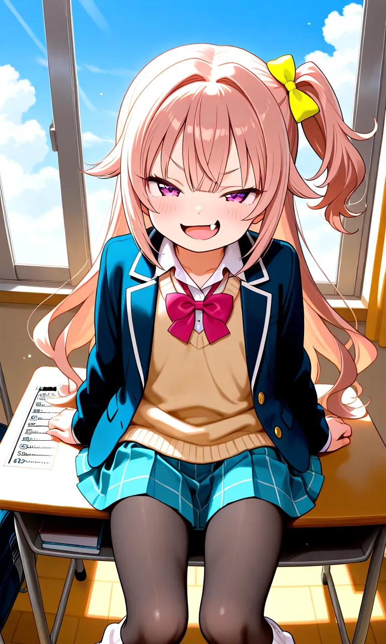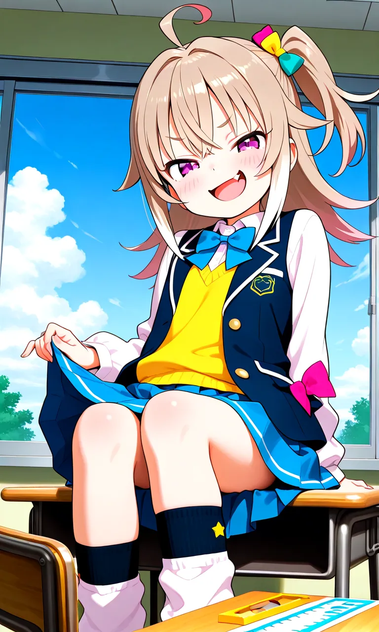 わあ、この画像、とっても可愛らしい女の子が描かれていて、心がほっこりしちゃいますね♪ 学校の教室で座っているポーズが自然で、笑顔が本当にチャーミング! 髪の毛の流れや制服のシワの表現が細かくて素敵だけ