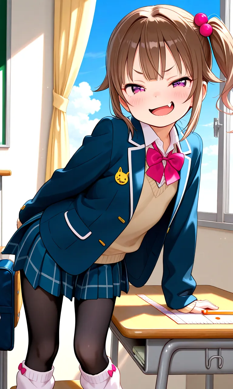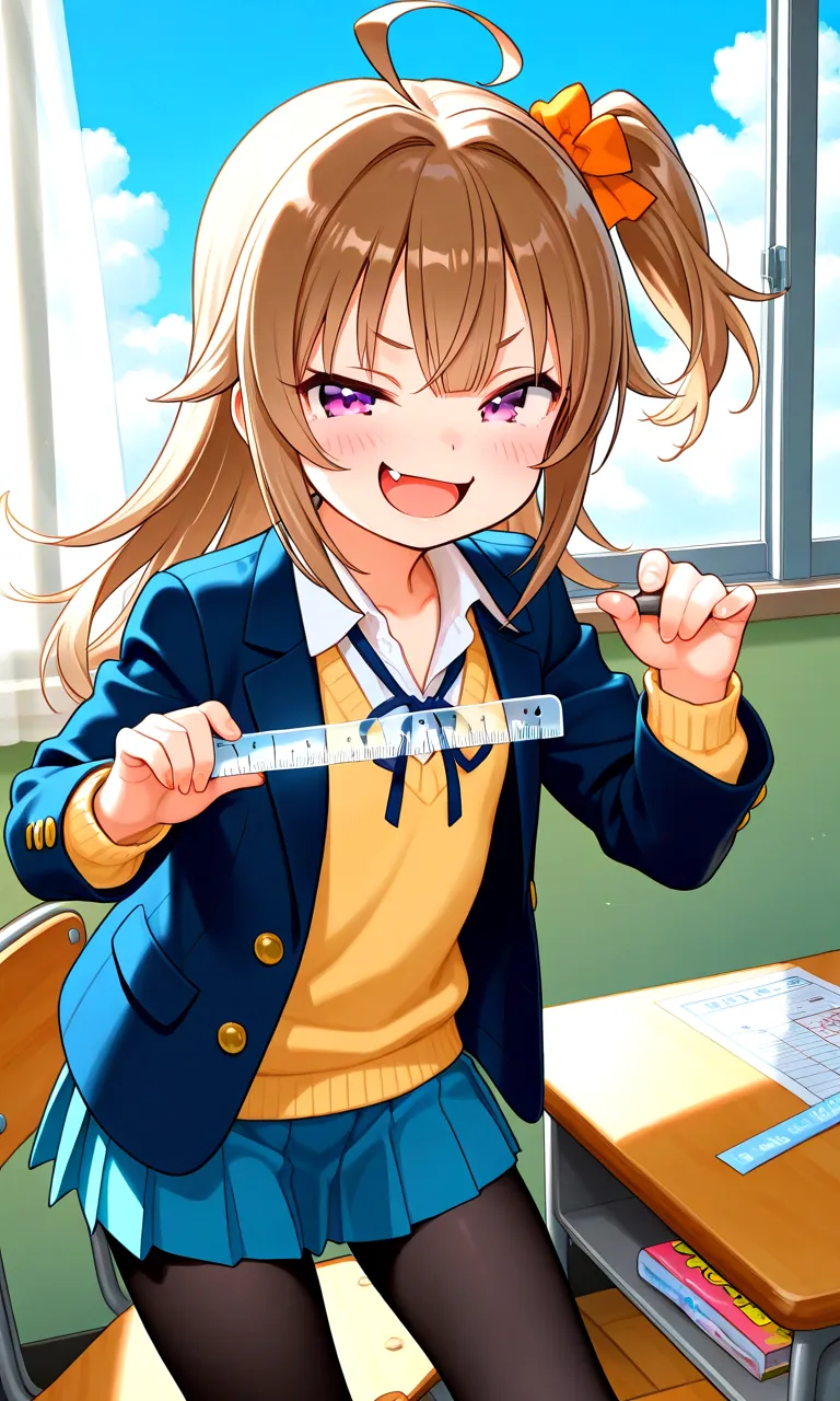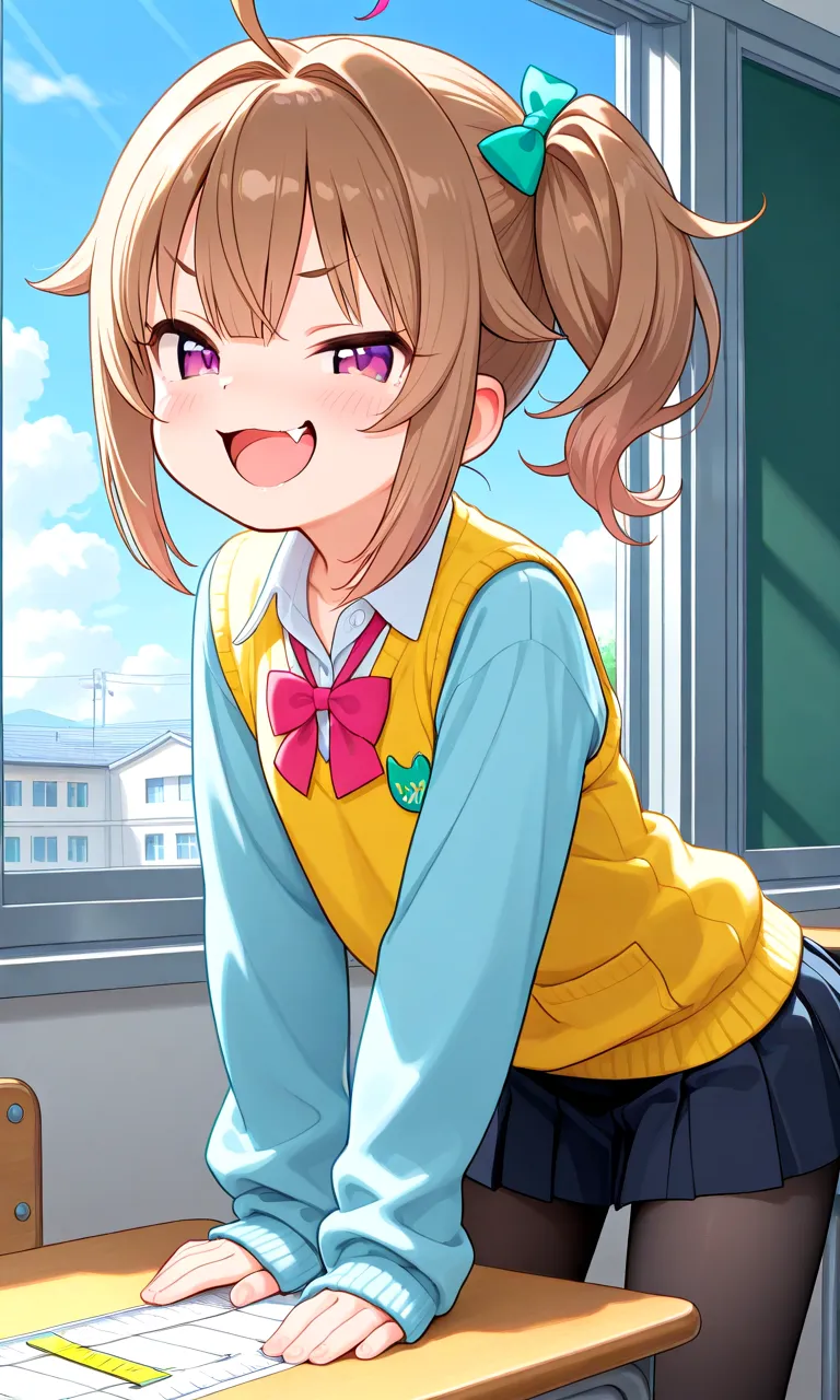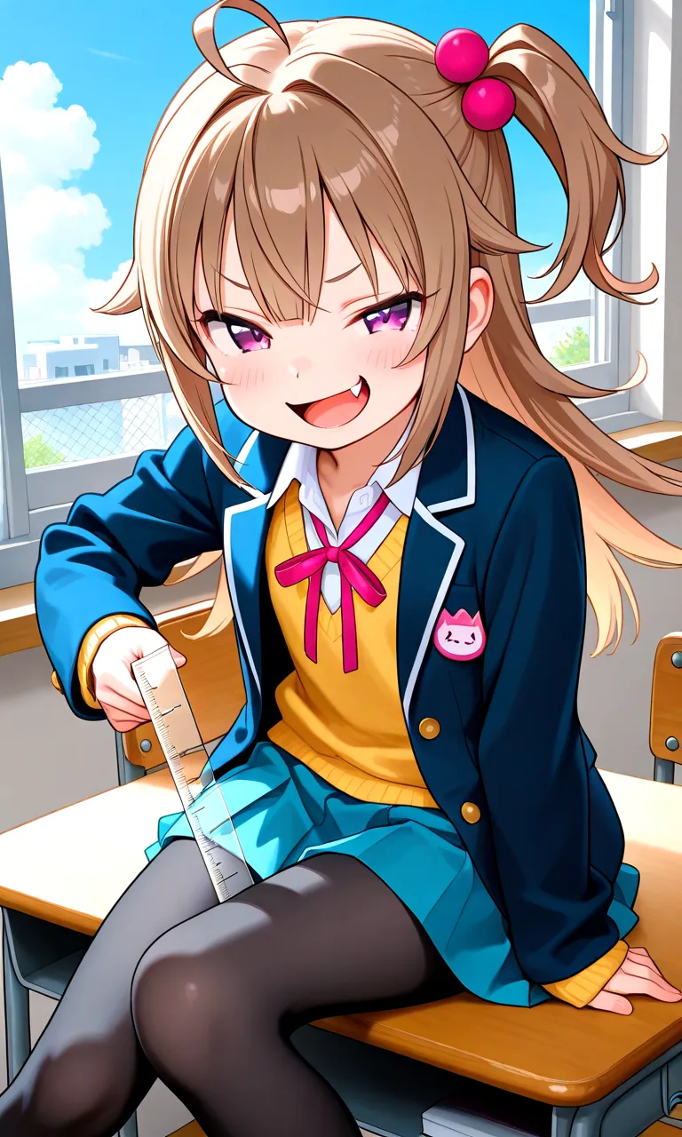 わあ、この画像、とっても可愛らしい女の子が描かれていて、心がほっこりしちゃいますね♪ 学校の教室で座っているポーズが自然で、笑顔が本当にチャーミング! 髪の毛の流れや制服のシワの表現が細かくて素敵だけ