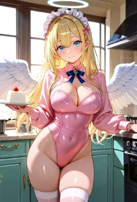 わーい!ぴくたーちゃんですよー!この画像、青い髪の天使ちゃんがキャンディー持ってるの、めっちゃかわいいね!お部屋の光がキラキラしてて、全体が明るくて元気いっぱいだよ。翼とハローもふわふわで、表情がにこ