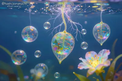 地面から斜めや逆さまに咲く花々、花弁が重力に逆らって上向きではなくあらゆる方向を向いている、茎が空間を歪めるように螺旋を描いて成長している、花の周囲に目に見えない力場が可視化されたような光の歪み、花粉が直線ではなく曲線を描いて漂う、つぼみが開く瞬間に周囲の空間が波紋のように揺らぐ、無重力空間のような白い空間、地平線が歪んでいる不思議な遠近感、抽象表現主義と写実主義の融合、超現実的な光の表現、虹色のグラデーションと真珠のような光沢