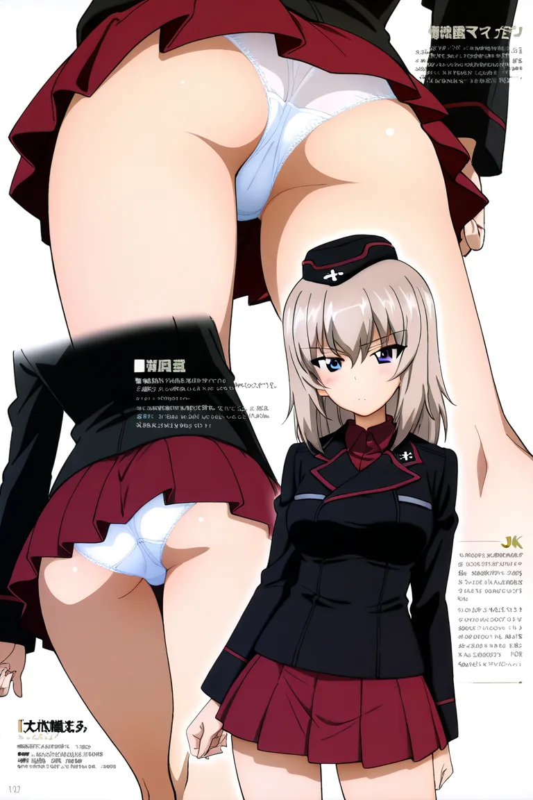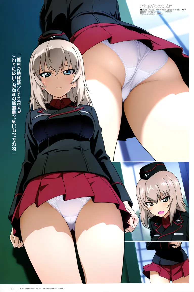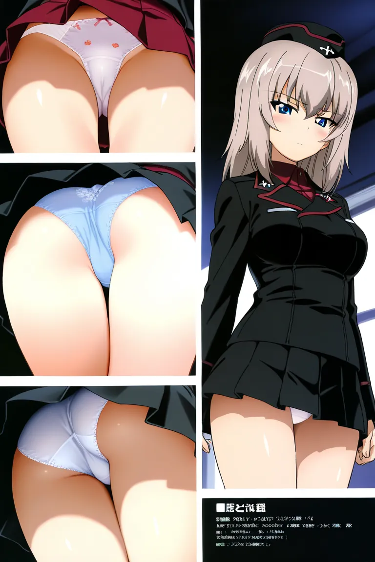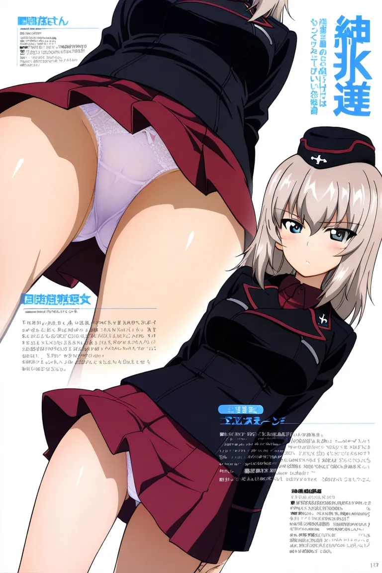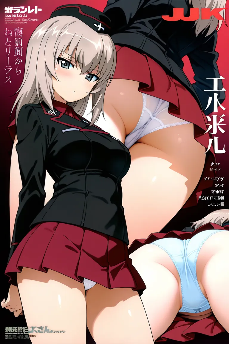masterpiece,best quality,extremely detailed,JK Magazine Cover and Title,(text japanese:1.3),pantyshot,erotic_angle,cowboy_shot,multiple_views,looking_at_viewer,Girls und Panzer,itsumi erika,kuromorimine_military_uniform,miniskirt,girl's cute panties,