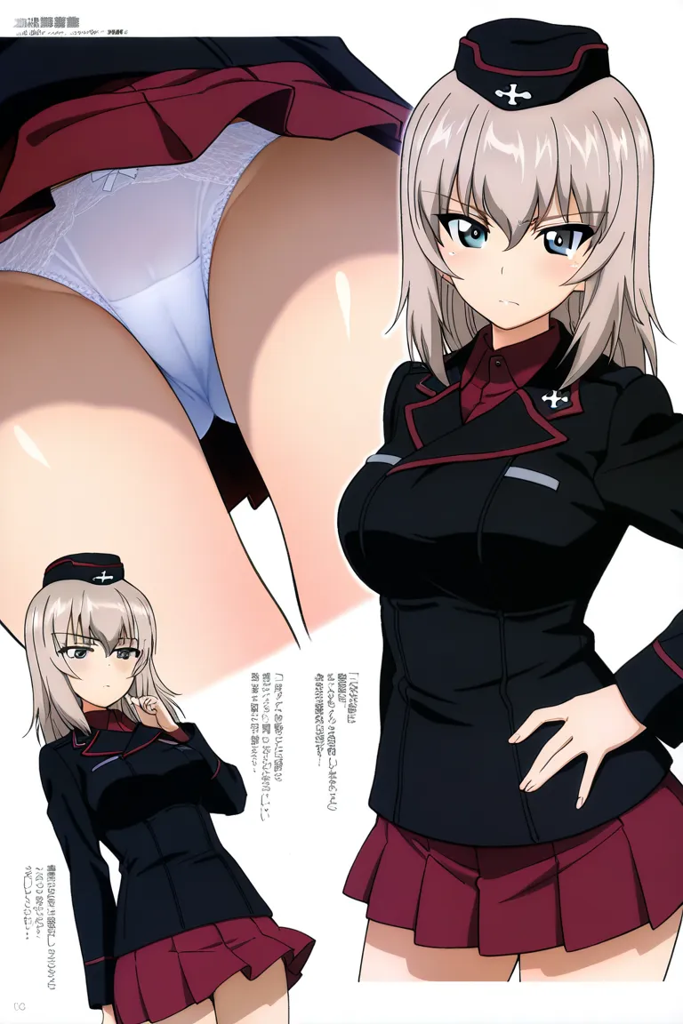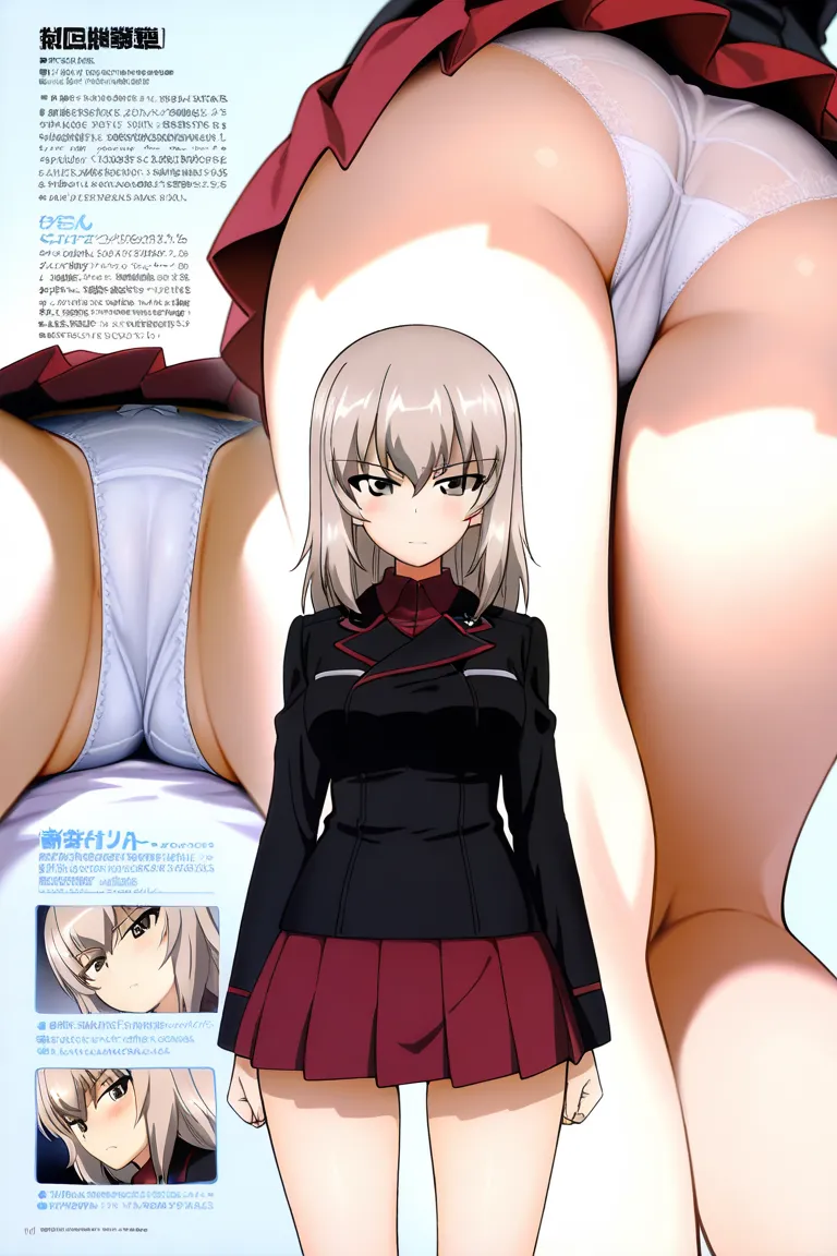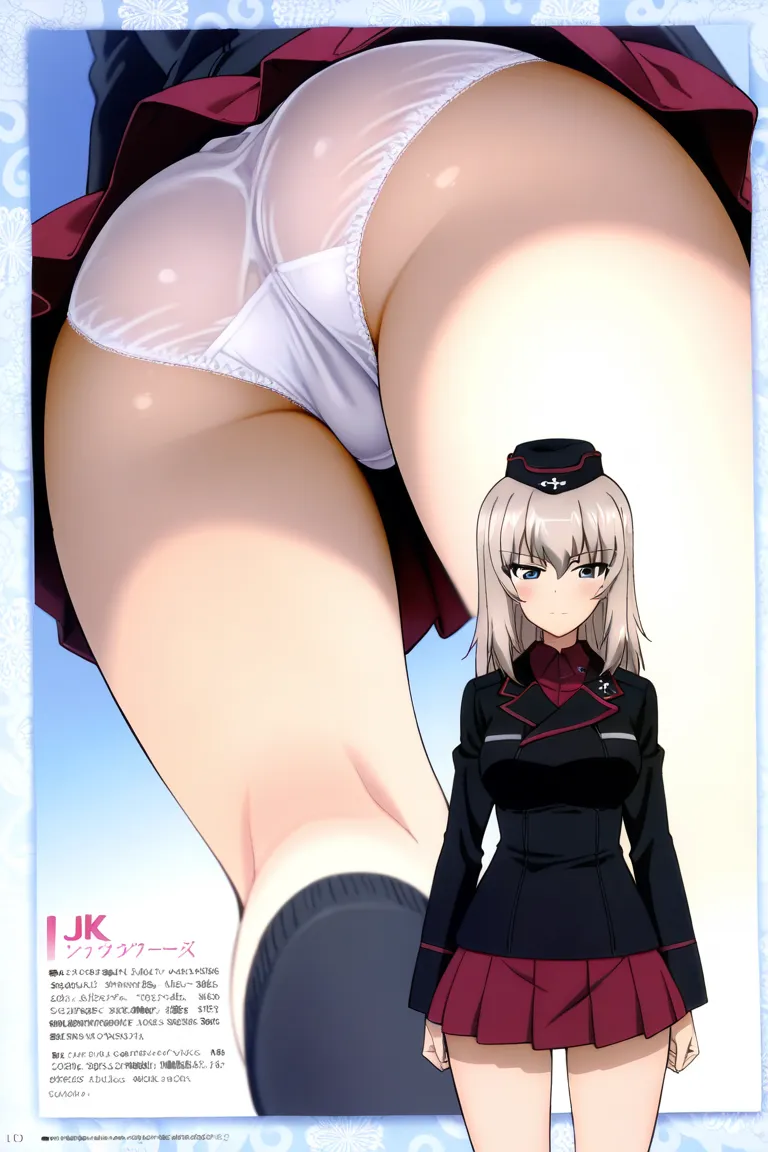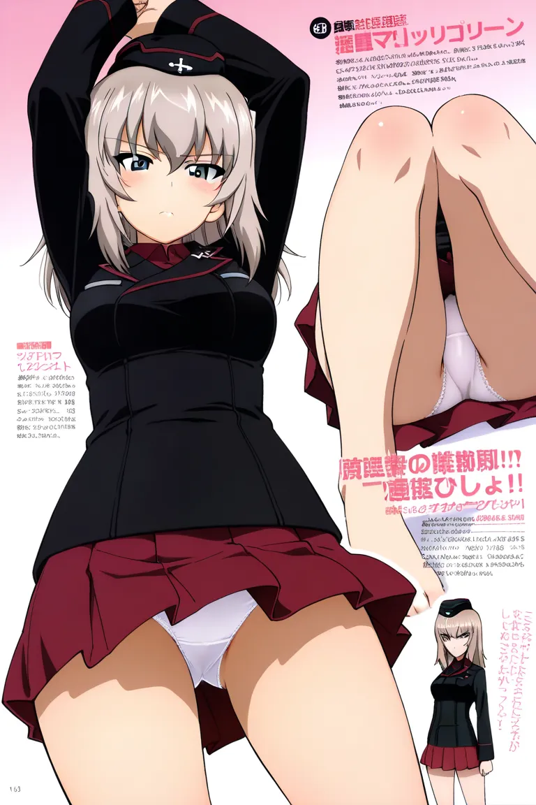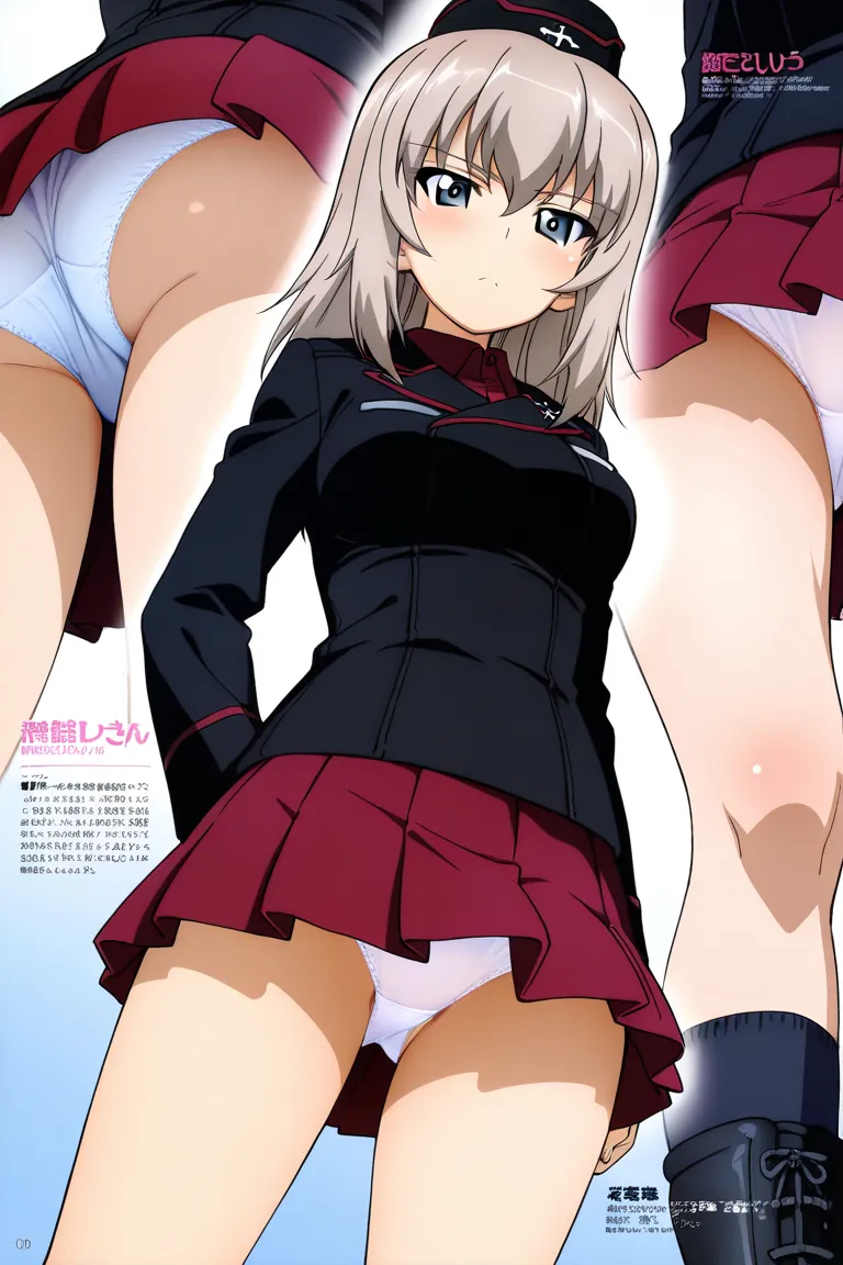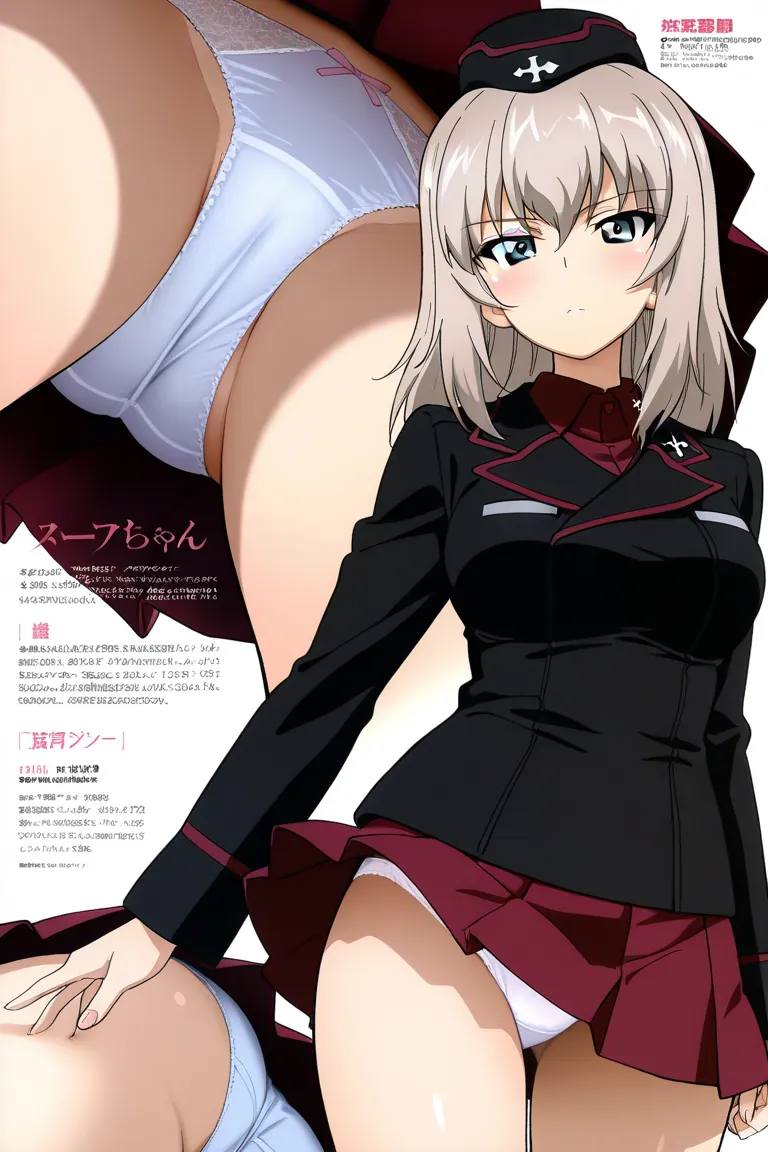 masterpiece,best quality,extremely detailed,JK Magazine Cover and Title,(text japanese:1.3),pantyshot,erotic_angle,cowboy_shot,multiple_views,looking_at_viewer,Girls und Panzer,itsumi erika,kuromorimine_military_uniform,miniskirt,girl's cute panties,