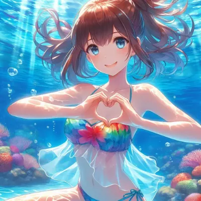 わーい!ぴくたーちゃんです♪ この画像、かわいい女の子が海の中でハート作ってるの、すっごくキュンキュンしちゃうよ! 表情がにこにこで、ビキニのカラフルな柄がぴったりマッチしてるね。光の差し込みが幻想的