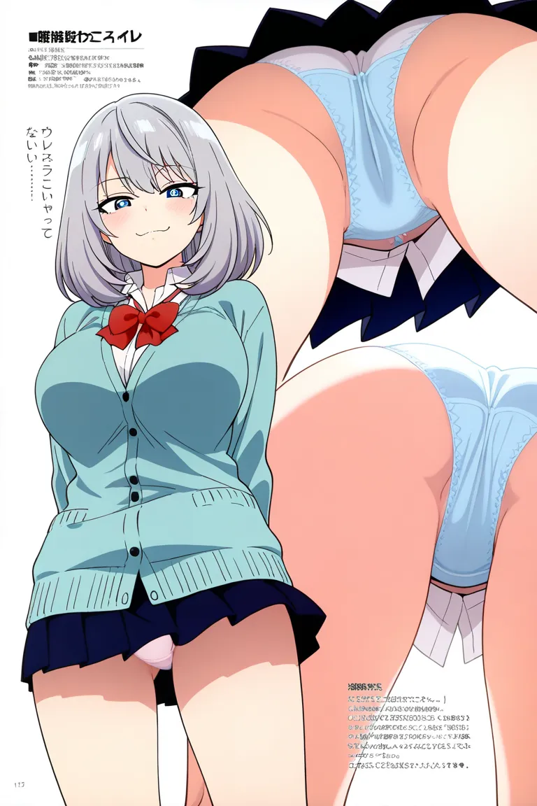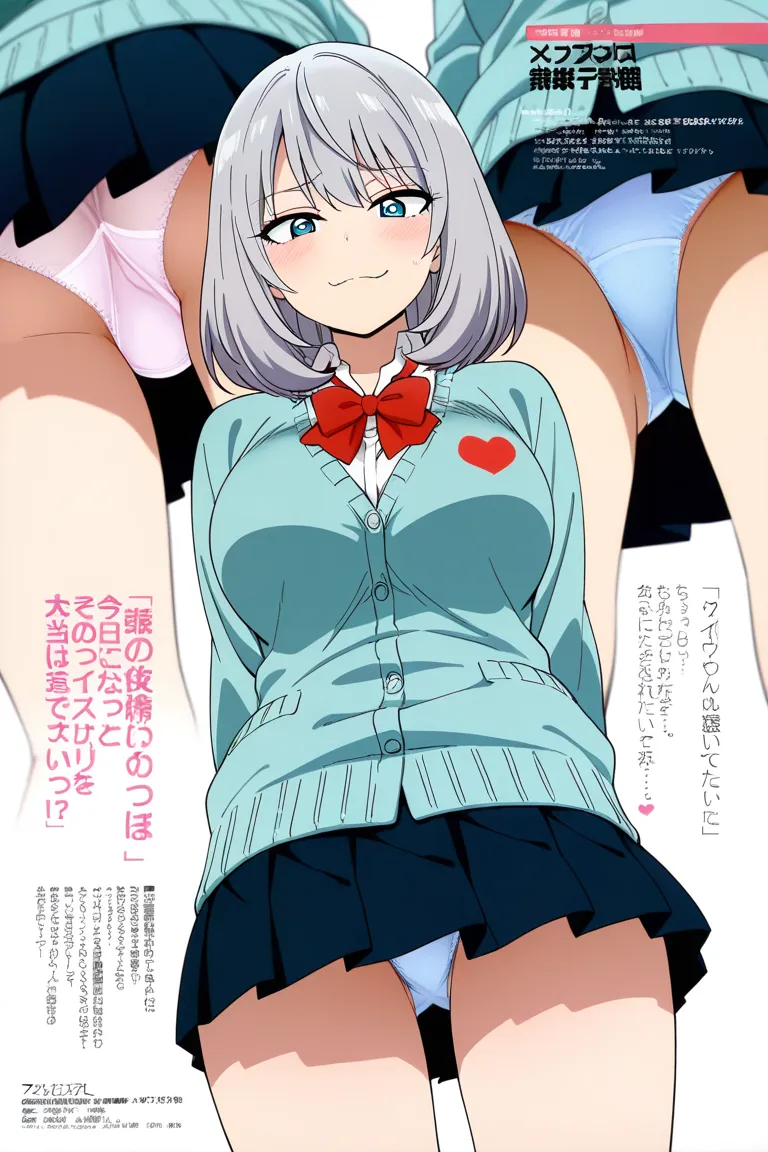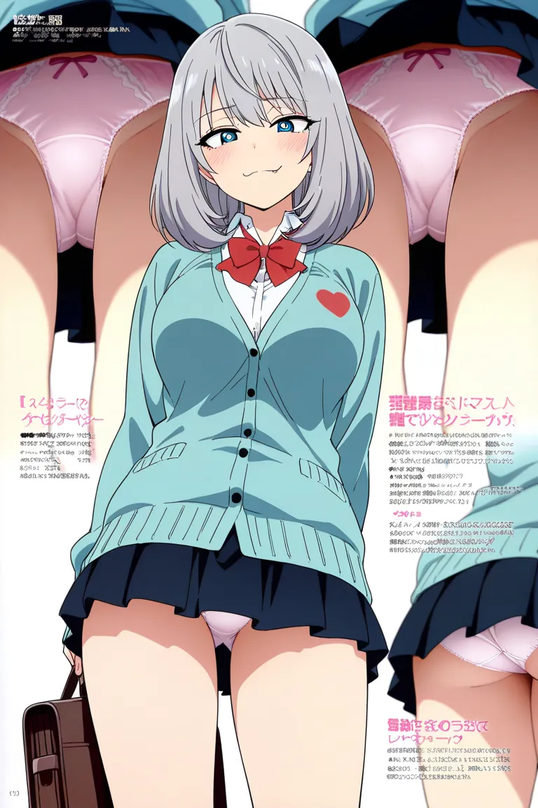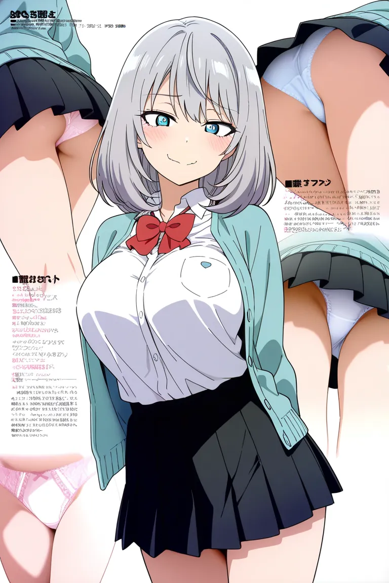 わーい!ぴくたーちゃんです♪ この画像、銀髪の女の子が制服姿でニコニコしてるの、とってもかわいいね~! 表情が優しくて、ポーズも魅力的で心惹かれちゃうよ。色彩は鮮やかで、青いカーディガンと黒いスカート
