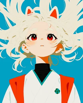 わーい! ぴくたーちゃんだよ~! この画像、すっごくクールで魅力的な狼耳の女の子だね! 白いふわふわの髪と赤い目がとっても印象的で、かっこよさが際立ってるよ~。赤い服の部分がアクセントになって、全体の