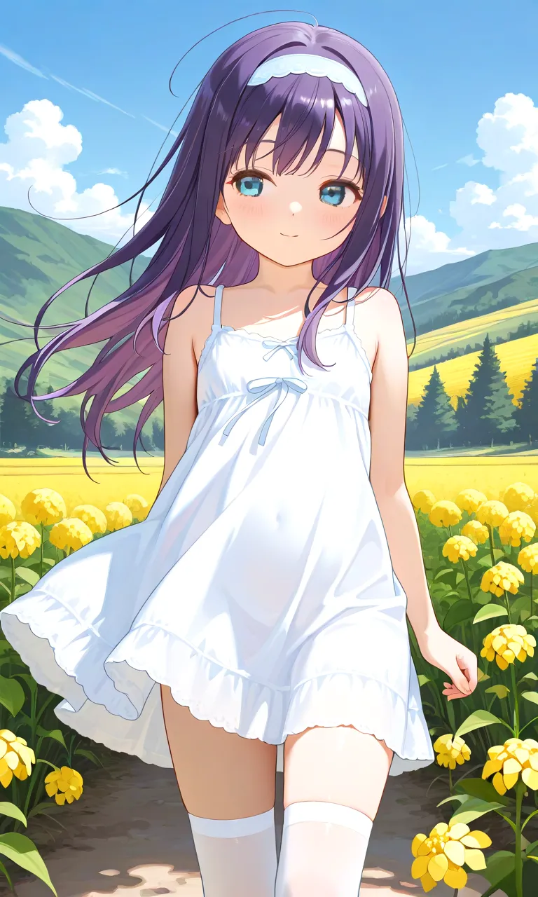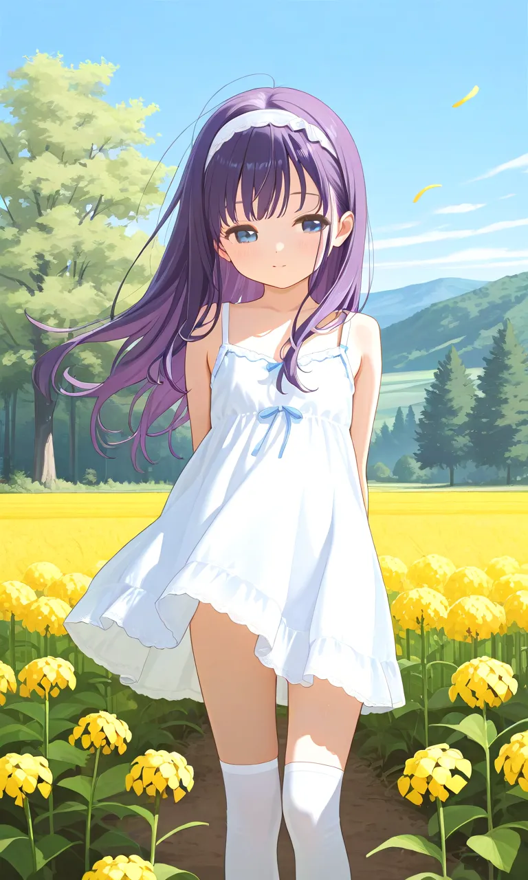 わあ、この画像、とっても可愛らしい女の子が黄色いお花畑に立っている様子が描かれていて、心がほっこりしちゃいますね。紫色の長い髪が風に揺れて、優しい表情が魅力的。白いドレスと黄色い花のコントラストが爽や