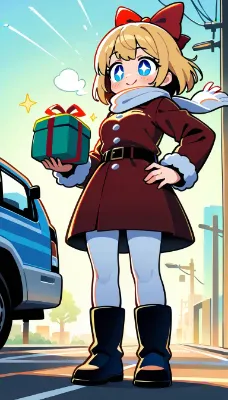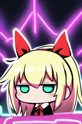 masterpiece, best quality, {{chibi}},{thick outline},{black outline},{{disheveled hair}},{{loli}}, 1girl,blond hair,blue eye,hair ribbon,red ribbon, {{{neon lights}}}, night,outdoors,
