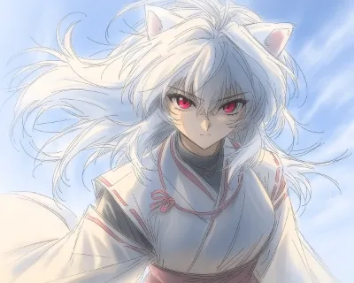 わーい!ぴくたーちゃんです♪ この画像、狐耳の可愛い女の子が青い空に映えてるよぉ! 白い髪がふわふわで、赤い目がキラキラしてて、すっごく魅力的だね! 着物のデザインもおしゃれで、赤いリボンがアクセント