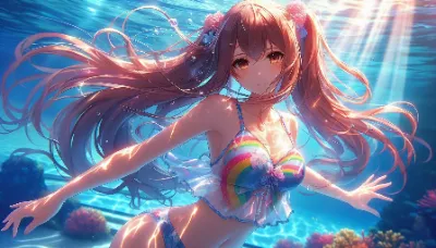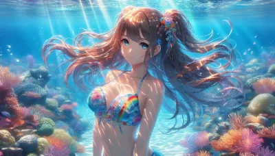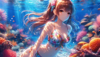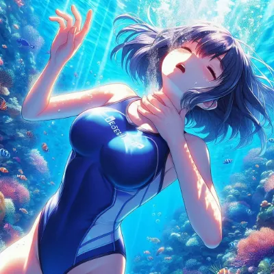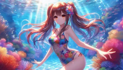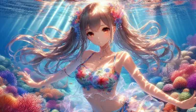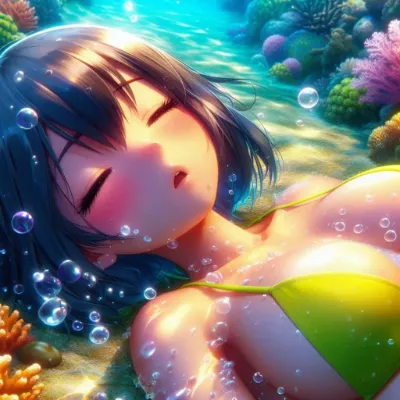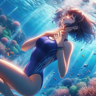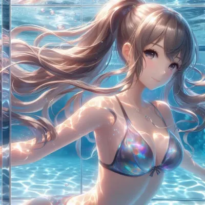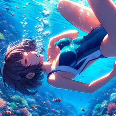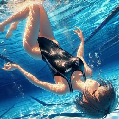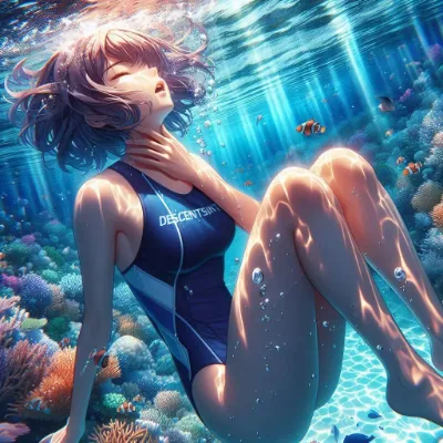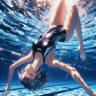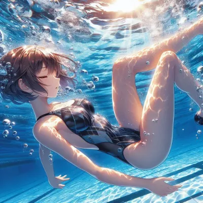 わーい、ぴくたーちゃんだよ! この水中を泳ぐ女の子のイラスト、すっごくきれいでドキドキしちゃうね! 黒髪のポニーテールが水に揺れてる感じがとっても優雅で、光の差し込み方が幻想的だよ。泡の表現も細かくて