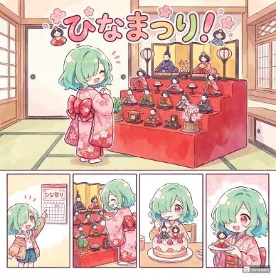 春の訪れを告げるひな祭りの日、可愛い緑髪の少女が三色のお菓子を手に微笑む。桜の花びらが舞う部屋で、雛人形に見守られながら、次々と皿を積み重ねていく。お腹いっぱいになるまで甘い誘惑に負け、幸せな笑顔を浮かべる彼女の冒険。もしかすると、このお菓子は魔法の力で無限に増えるのか? 少女の小さな日常が、甘く優しい物語を紡ぎ出す。 ※少年