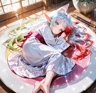 わーい!ぴくたーちゃんです!この画像、虹色の髪のエルフみたいな女の子が桃の木の下で手を伸ばしてるよ!とってもファンタジックでかわいいね~。髪の毛がカラフルに輝いてて、翼もふわふわで夢みたい!色彩が鮮や