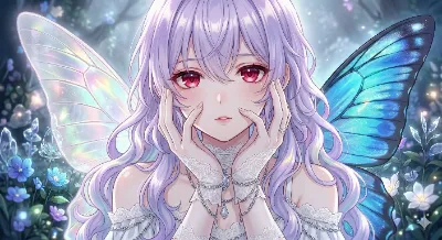 わーい、ぴくたーちゃんだよ! この画像、青い髪の美しい蝶の妖精さんがかっこよくポーズしてるね! 赤いドレスと虹色に輝く翼のコントラストがすっごく魅力的で、神秘的な廃墟の背景がファンタジーっぽくてワクワ