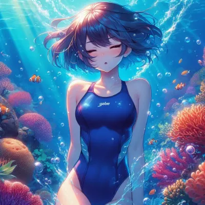 Detailed anime-style illustration of a young Asian girl wearing a sleek competitive indigo swimsuit at the bottom of the Coral Sea. She has short, flowing hair billowing around her. She is clearly struggling to hold her breath underwater, exhaling a stream of shimmering air bubbles from her slightly parted lips. Her eyes are closed lightly, and her expression shows both determination and difficulty. Best Quality.