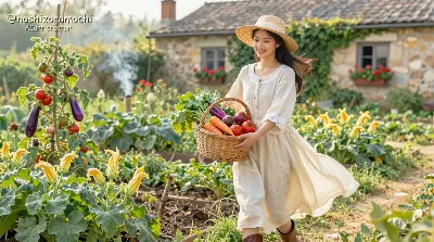 天井の低い素朴な農家の台所、厚い木製のテーブルの上には焼きたてのパンが冷めるために置かれ、湯気が立ち上っている。窓からは午後の柔らかな光が差し込み、空中に舞う小麦粉の粒子が金色に輝いている。テーブルの周りには使い古された木製の椅子が配置され、その一つには花柄のクッションが置かれている。壁には銅製の鍋やフライパンが吊るされ、年季の入った木製の棚には陶器の瓶やガラスの保存容器が整然と並ぶ。窓辺の小さな花瓶には野の花の束が活けられ、ラベンダーとデイジーが可憐に揺れている。テーブルの上には開いたレシピ帳、木製のローリングピン、白い陶器のボウルに入った新鮮な卵、小麦粉の袋がある。背景の暖炉では薪が静かに燃え、鋳鉄製のケトルが掛けられている。床は不揃いな石のタイルで、ところどころに手織りのラグが敷かれている。全体的に温かく居心地の良い雰囲気で、オランダ絵画の静物画を思わせる光と影のコントラスト、細部まで描き込まれた質感表現。