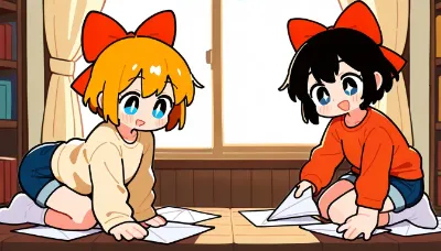 わーい!ぴくたーちゃんです♪ この画像、すっごくかわいいよ!青いドレスの金髪の女の子と緑の制服の黒髪の女の子がお手々つないでお散歩してるの、心がほっこりしちゃうね!街並みがカラフルで、チューリップやバ