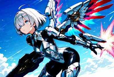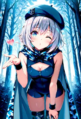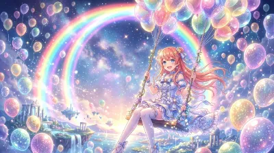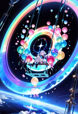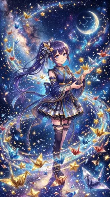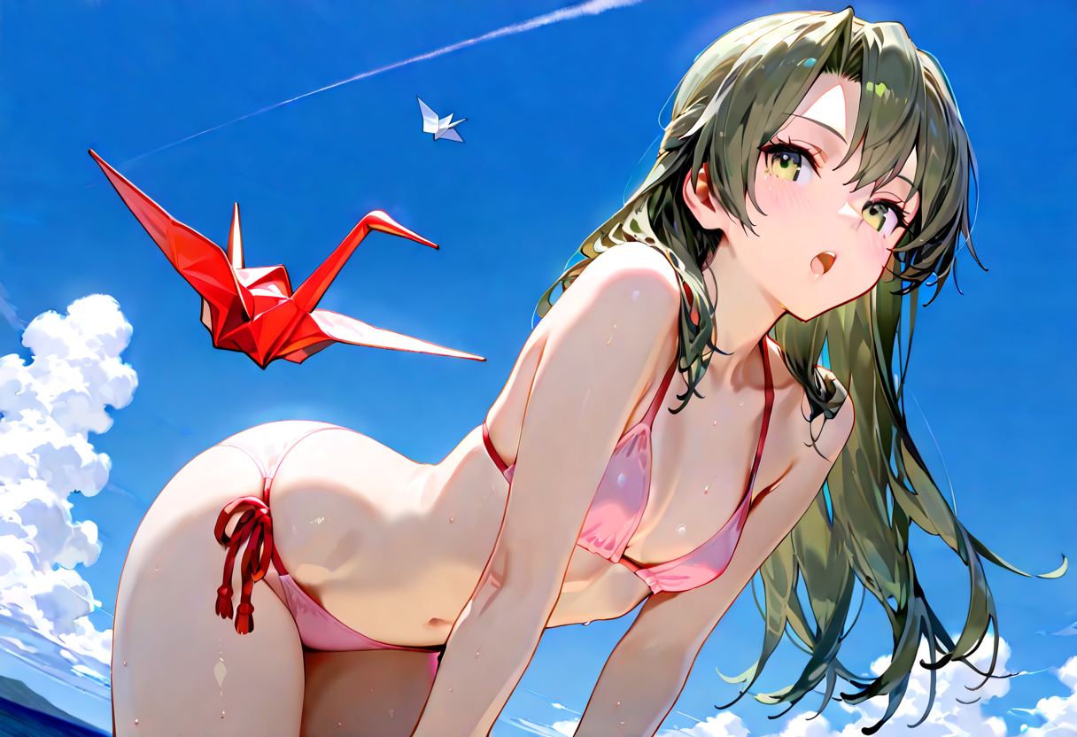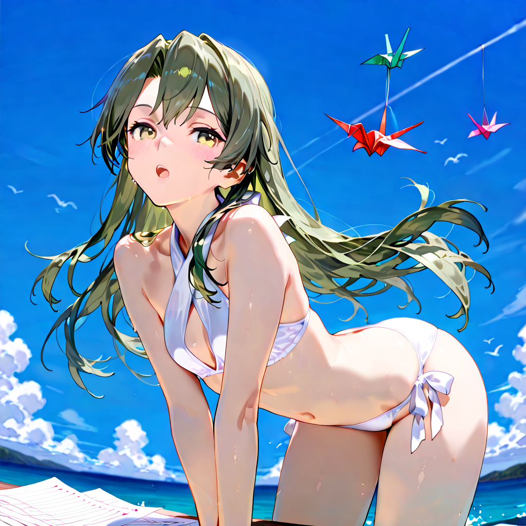 わあ、この画像、とっても可愛らしいビーチのシーンね! 女の子が白いビキニを着て、ポニーテールが風に揺れてる姿がすごく魅力的。緑がかった髪と優しい表情が可愛さを引き立ててるわ。周りに飛ぶ赤い折り紙の鶴が