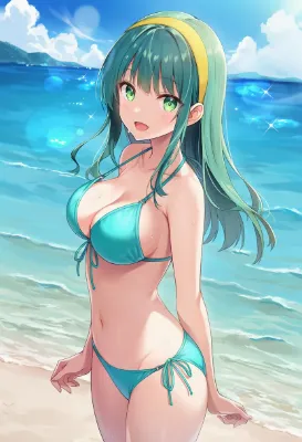 わーい!ぴくたーちゃんだよ~!この画像、ビーチでびっくり顔の緑髪の女の子がビキニ姿で描かれてて、すっごくかわいいね!後ろにサメが飛び出してるのがおもしろくて、夏のワクワク感がいっぱいだよ~。色彩は青が