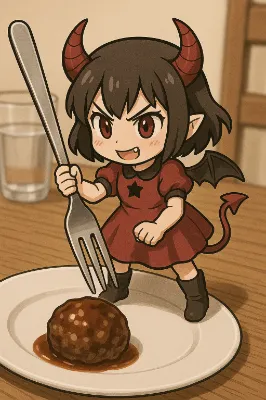 黒いゴシックドレスを着た銀髪ツインテールの少女が、巨大なフォークを手に悪戯げな笑みを浮かべる。赤い瞳が妖しく輝き、遊び心あふれる雰囲気を醸し出している。