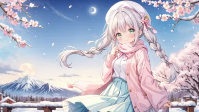 冬の名残が残る湖畔で、銀髪の少女は優しく微笑む。ピンクのコートに身を包み、舞い散る桜の花びらを眺めながら、彼女は心に秘めた願いを囁く。雪景色と春の訪れが交錯するこの場所で、少女の冒険が始まる。遠くの家並みが物語の舞台を予感させ、風に揺れる三つ編みが彼女の純粋な想いを象徴する。あなたも一緒に、彼女の旅路を想像してみては?