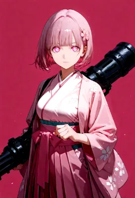 masterpiece, best quality, extremely detailed, high resolution, beautiful face, Japanese anime,1girl, (cowboy shot:1.3), BREAK ((light purple hair:1.3)), (ponytail:1.3), (blunt bangs:1.2), BREAK (wearing wisteria flower 1hair ornament only:1.3), BREAK ((light purple hair:1.3)), BREAK (tareme, with eyelashes), (beautiful detailed eyes:1.2), (light smile), (closed mouth), 13 -year-old ,158cm tall, toned, small breasts, original character, fantasy, BREAK (beautiful fingers:1.3), (light purple kimono:1.3), (pink 1obi), (purple hakama:1.3), (elegant kimono, wide obi, wisteria flowers patterns:1.3), (holding a book:1.3), (arm at side:1.3), BREAK (indoor scene, simple background:1.5), (light purple background:1.4), (no flowers in background:1.4), looking at viewer, BREAK (shoot from front:1.3), medium shot,Detailed, (front view:1.5)