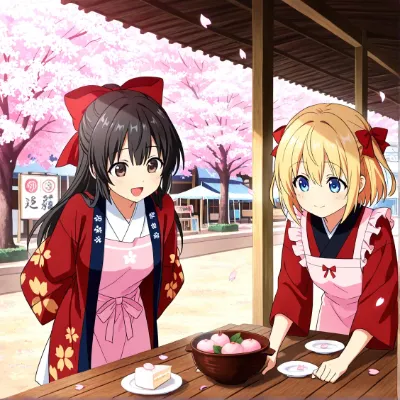 わーい!ぴくたーちゃんです♪ この画像、ふたりの可愛い女の子が浴衣姿でお茶してるシーンだね! ピンクのケーキがとっても美味しそうで、秋の葉っぱの髪飾りもキュート! 背景の和室が暖かくてほっこりするよ。