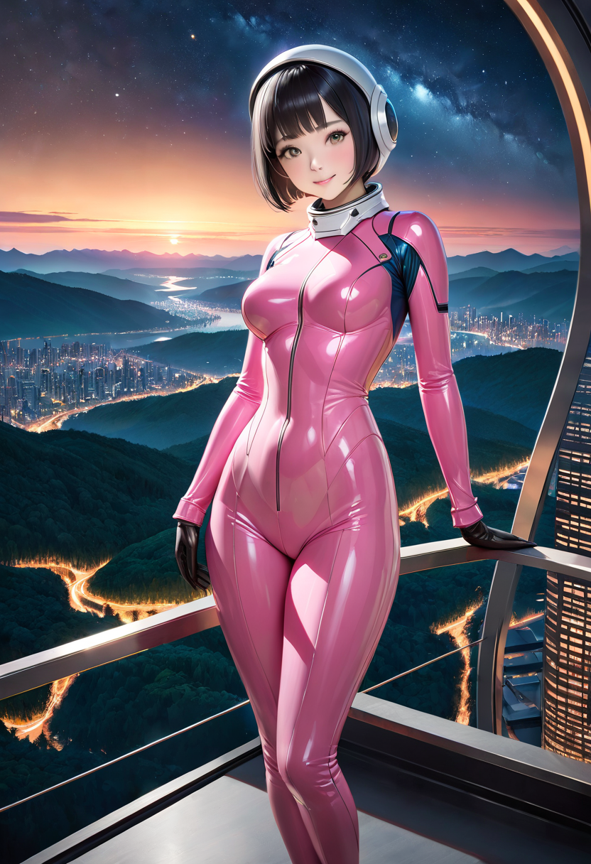 (photorealistic:1.4), (RAW photo), masterpiece, best quality, extremely detailed, lady, neat and clean, elegant, polite, (shy:0.9), black hair long bob cut, almond eyes, (smile:0.9), slim fit, (space helmet, face shield:1.3), full sleeves, high necked, (pink rubber bodysuit, long gloves, platform long boots), standing pose, (high angle shot:0.6), futuristic city, stylish lamplight, cosmic buildings, good view, forest, low mountain range, late evening, sunset sky