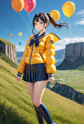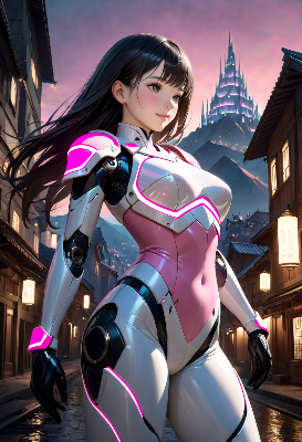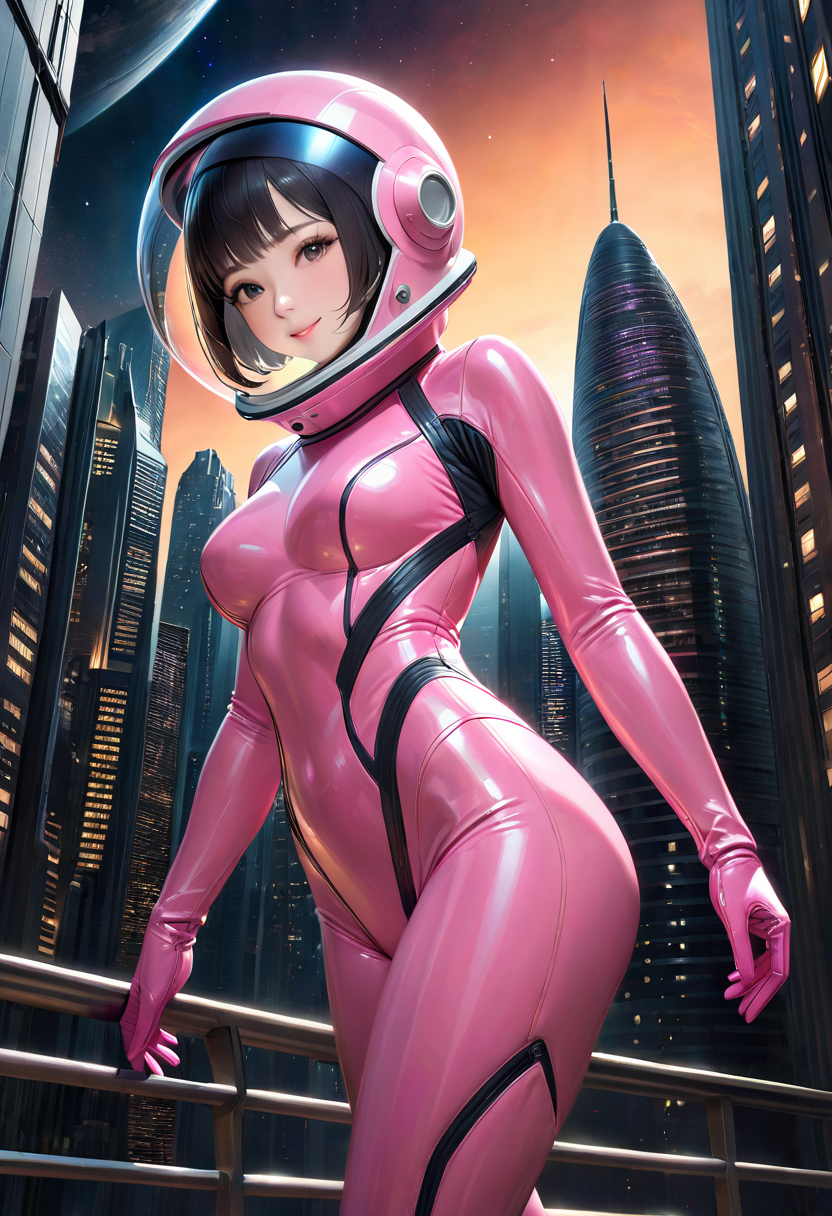 わあ、この画像、とっても素敵ですね! ピンクの宇宙服を着た女の子が、未来都市の夕焼けをバックに立っている姿が印象的です。彼女の大きな瞳と優しい笑顔が可愛らしくて、心を掴まれちゃいます。スーツの光沢感や