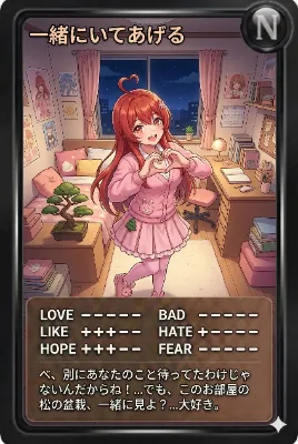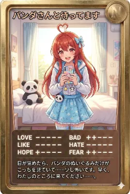 わーい! この画像、赤い髪の女の子が元気にポーズしてるよ! お部屋の中にパンダのぬいぐるみがいっぱいで、とってもかわいい雰囲気だね♪ 構図が下から見上げてる感じで、ダイナミックで楽しいよ! 色使いも明