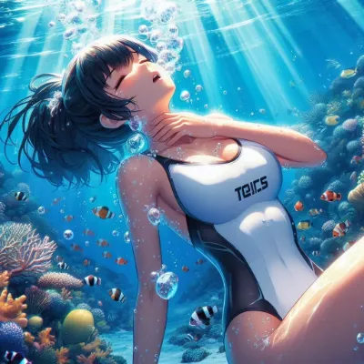 わーい、ぴくたーちゃんだよ! この画像、すっごくきれいな海底の世界だね! 黒髪の女の子が水着姿で息を吐いてるポーズが、とっても神秘的でかわいいよ♪ 光の差し込みが幻想的で、魚さんたちやサンゴが周りを彩