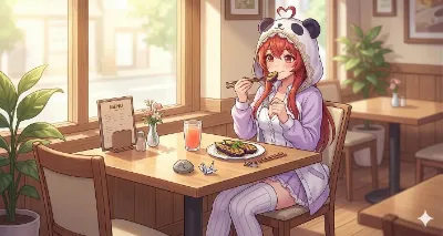 わーい!この画像、赤髪の女の子がパンダフード着てお部屋でご飯食べてるの、めっちゃかわいいよぉ!ぴくたーちゃん、ほっぺた赤らめてる表情がキュンキュンしちゃう♪ 背景のパンダグッズや飲み物もほんわか雰囲気
