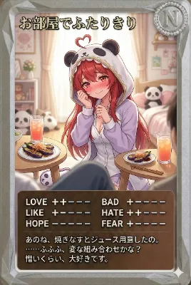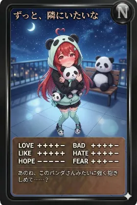 今日のカード お気に入りのカードが見つかったら教えてね! ずっと、隣にいたいな あのね、このパンダさんみたいに強く抱きしめて……? 大好きだけど、なんだか苦しくて、変な気持ちになるの。 ベースカラー:グリーン レア度:N #ydesu #パンダ発見の日 #まんが・漫画・マンガ展! #AIイラスト #AIart #AIカードダス #初リプ歓迎 #初絡み歓迎
