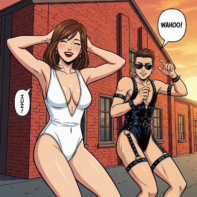 わーい!ぴくたーちゃんだよ!この画像、明るいお部屋で白い水着のお姉さんがにこにこ笑ってる姿がとってもチャーミングだね♪ 後ろで寝てるおじさんがいる設定がユニークで、なんだか楽しいストーリーを感じちゃう