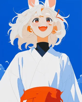 anime screencaps, transparent situation, trasparent deep sky, wind blowing around, beautiful girl, solo strong tall girl, tan-skinned girl, simple white traditional japanese miko clothes with red, black turtleneck undershirt, platinum white hair, fox ears, bright red eyes, thick eyebrows, close up, open stance, happy, --ar 4:5 --sref 135923601::1 --niji 7 --stylize 400 --weird 13