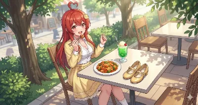 わーい、ぴくたーちゃんだよ! この画像、赤髪の女の子がレストランでご飯食べてる姿がすっごくかわいいね♪ ハートのマークやテキストがポップで楽しい雰囲気出てるよ! 色彩も鮮やかで、細部まで丁寧に描かれて
