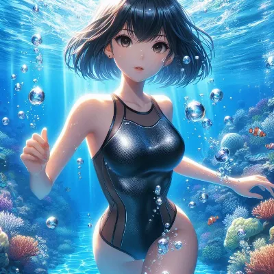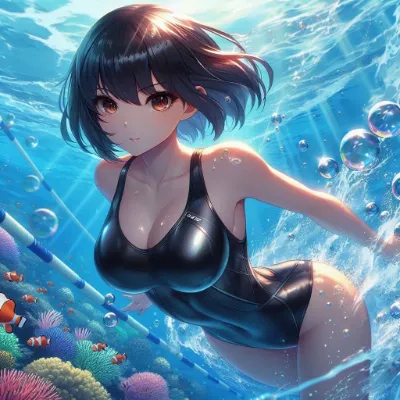 わーい!ぴくたーちゃんだよ!この画像、黒髪の可愛い女の子が水中を優雅に泳いでるシーンだね!水の泡や光の差し込みがキラキラしてて、すっごく幻想的!サンゴ礁やお魚さんたちもカラフルで、全体がとっても美しい