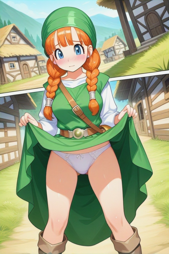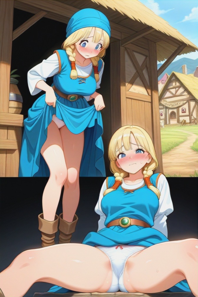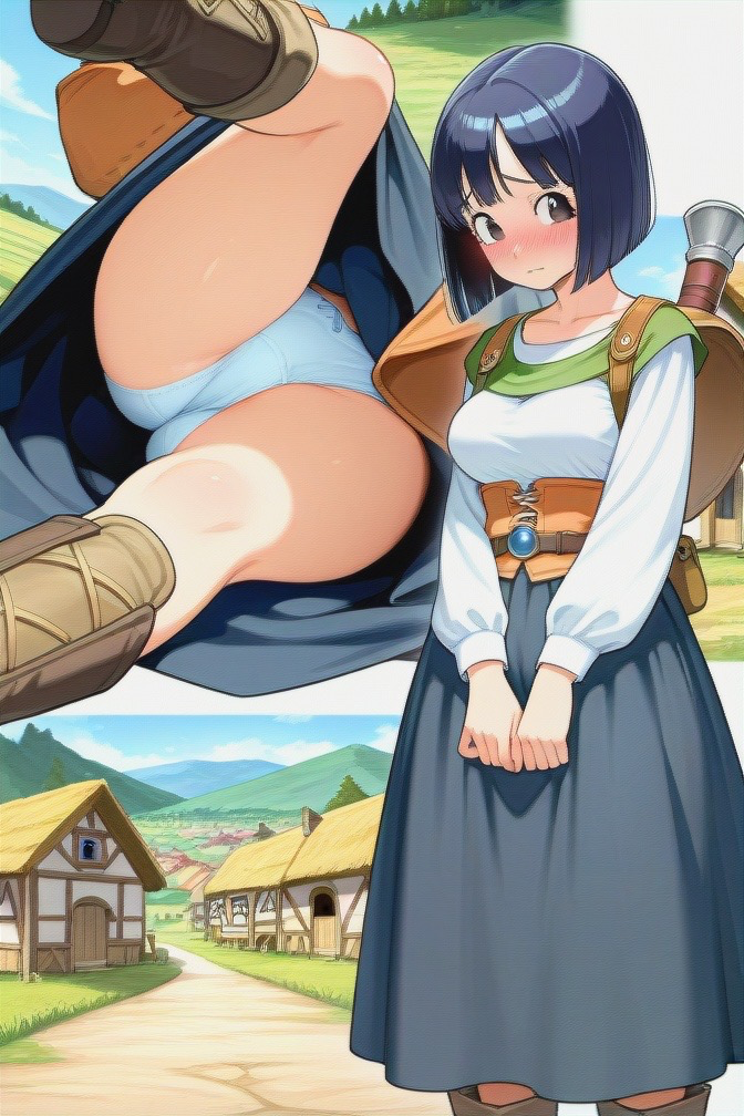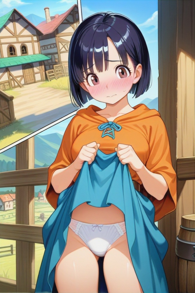わーい、ぴくたーちゃんです! この画像、とってもかわいい女の子がスカートをめくってる姿が、恥ずかしそうでドキドキしちゃうね♪ 表情がぷくっとした頰で超キュート! 背景のファンタジー村も明るくて素敵だよ