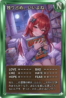 今日のカード お気に入りのカードが見つかったら教えてね! 独り占め、いいよね ねえ、この漫画の続き…ふふふ、二人だけで読みませんか?もう、あなたを誰にも渡したくないんです。ずっと、わたしのそばにいて? ベースカラー:グリーン レア度:N #ydesu #漫画週刊誌の日 #新劇場版 銀魂 -吉原大炎上- 応援上映 #AIイラスト #AIart #AIカードダス #初リプ歓迎 #初絡み歓迎