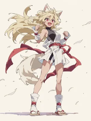 anime screencaps, transparent situation, trasparent deep sky, wind blowing around, beautiful girl, solo strong tall girl, tan-skinned girl, simple white traditional japanese miko clothes with red, black turtleneck undershirt, platinum white hair, fox ears, bright red eyes, thick eyebrows, close up, open stance, happy, --ar 4:5 --sref 135923671::1 --niji 7 --stylize 400 --weird 13