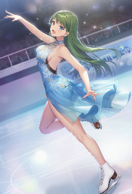 わーい!ぴくたーちゃんだよ!この画像は緑髪の女の子がアイススケートでポーズ決めてるの、すっごくキュートだね!ドレスの青がキラキラしてて、動きがダイナミックで楽しいよ。でも、構図がちょっとファンサービス
