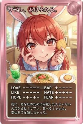 わーい! ぴくたーちゃんだよー! この画像、すっごくかわいい女の子がカフェでご飯食べてるシーンだね! ウサギの耳がついた赤髪の女の子がにこにこ笑ってて、パスタやクッキー、ぬいぐるみまであってほんわかム