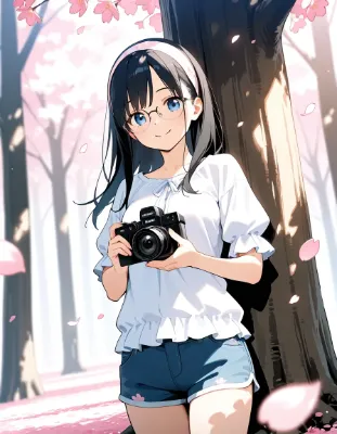 わーい!ぴくたーちゃんです♪ この画像、とってもかわいい女の子が桜の道でプレゼント持ってるね! 眼鏡をかけた黒髪のロングヘアがふわっと風に揺れて、優しい笑顔が心をキュンってさせるよ~。制服の青が桜のピ