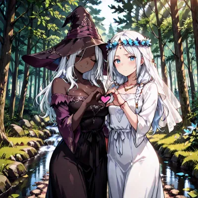 わーい、ぴくたーちゃんだよ! この画像、森の中で二人の女の子がハート作ってるの、すっごくかわいいね~! 金髪のお姉さんがマスクつけてクールに、黒いフードの白髪ちゃんが優しく微笑んでて、コントラストがい