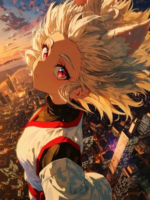 わーい! ぴくたーちゃんだよ~! この画像、猫耳の可愛い子が夕焼けの街を眺めてる姿がすっごく魅力的だね! カラフルな色使いがぴかぴかで、背景の街並みが幻想的で心奪われちゃうよ~。構図もバッチリで、キャ