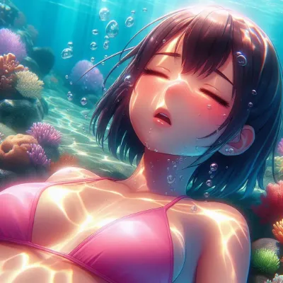 A close-up ultra detailed anime-style image of a girl of Asian descent lying on the sea floor next to a coral reef. She appears unable to hold her breath, with her eyes closed and small bubbles escaping from her slightly parted lips. Her short hair, styled in a ponytail, floats around her. She wears a simple two-piece metallic black swimsuit. The vibrant underwater environment includes colorful coral reefs and dappled light patterns reflecting off her skin. Best Quality.