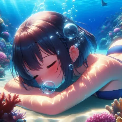 わーい! ぴくたーちゃんだよ~! この画像、すっごくかわいい海底の女の子だね! ビキニ姿でゆったり寝てる感じが、リラックスしてて癒されるよ~。珊瑚のカラフルな色合いがキラキラしてて、泡の表現も細かくて
